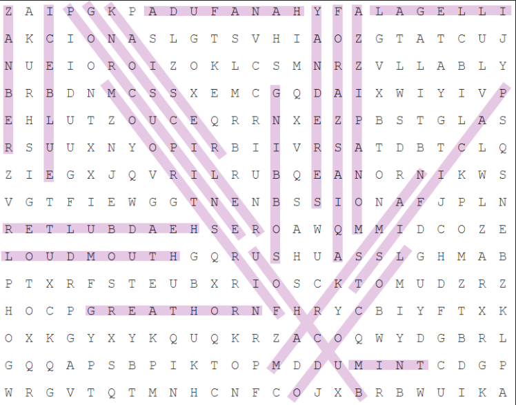 Words to find: BUCHOU, FIRSTROOM, FORAZSAIQA, GREATHORN, HANAFUDA, HEADBULTER, ICEBLUE, ILLEGAL, KAISER, LOCODO, LOUDMOUTH, MARKSMAN, MINT, MONAPIZZA, PACIFIST, PORCUPINE, RELICSONG, SOBBING, YANDERES, ZANBER