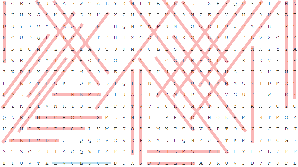 Words to find: AIRBLAST, ARROWS, BOXWEAPON, CINEMA, CORPSES, COURTSEIM, DREAMISLAND, EMPOWERING, FIREFLIES, FOULMOUTH, HAPPYLUCKY, INTERACTION, IRONTAIL, LORIKEET, MAGICIAN, MECHONIS, MELODY, MIRAIZURA, MOUNTAINS, NETSAFETY, NEWRECRUIT, NIICHAN, RAZORLEAF, ROLLER, SHRIMP, STRINGS, SUZUMUSHI, THRILLER, UTAKATA, WINDOM