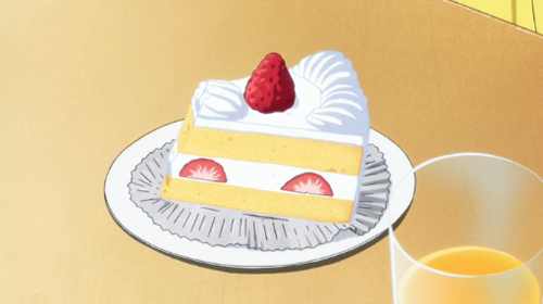 Can you tell Mitama the name of the series this cake display is from? Tell her, and she says she'll give you a slice and eight cards as thanks!