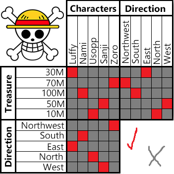 ❧ To use the grid, you simply cross-reference what you do and don't know. You can use dots for things you definitely know are true and crosses for things you definitely know are false.