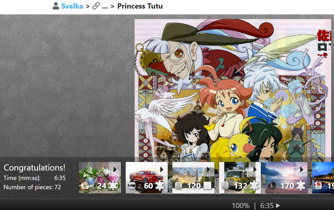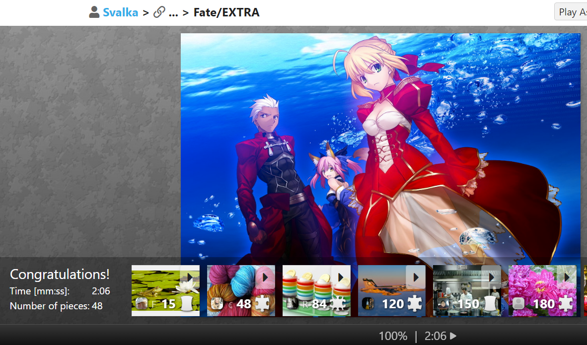 | Series: Fate/EXTRA Pieces: 48 Rotate: No Link to puzzle: here | Series: Princess Tutu Pieces: 72 Rotate: Yes Link to puzzle: here | Series: Shoujo Kageki Revue Starlight Pieces: 150 Rotate: No Link to puzzle: here |