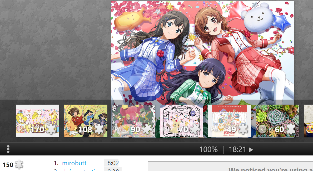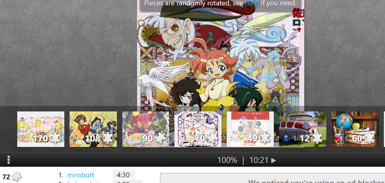 3. the number of pieces - please remember to include this in your screencap! (If you no longer see the congratulations banner with your time/pieces, you can include the number of pieces in the bottom left beside the name of the puzzle creator.)