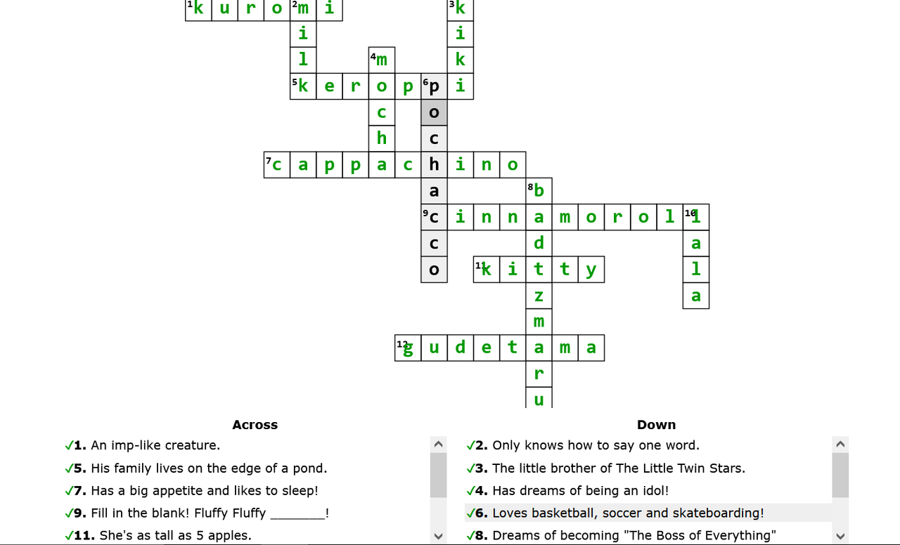 Down 2. Only knows how to say one word. 3. The little brother of The Little Twin Stars. 4. Has dreams of being an idol! 6. Loves basketball, soccer and skateboarding! 8. Dreams of becoming "The Boss of Everything" 10. The older sister of The Little Twin Stars. |